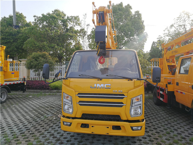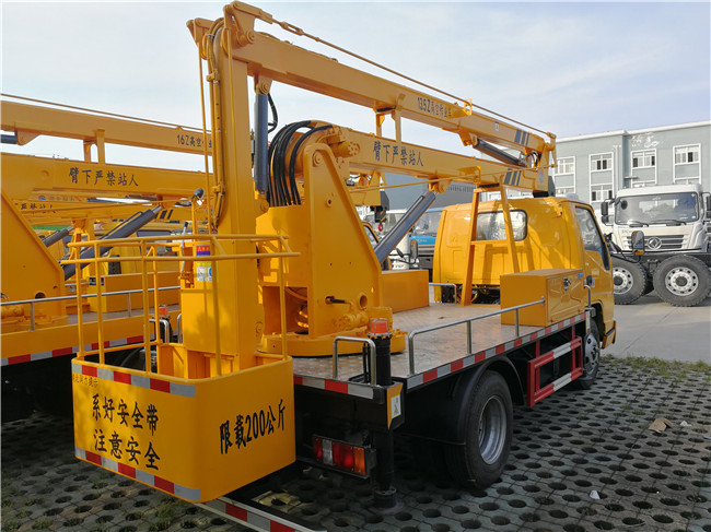 上裝三節折疊臂結構,四條平衡拉桿,平衡拉桿為實心。上下兩套操作裝置,旋轉轉臺和工作斗各一處。四條支腿帶爆閃燈,工作斗帶夜間照明燈。滿足夜間作業需求。