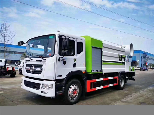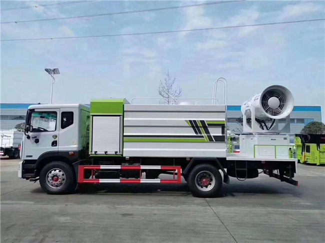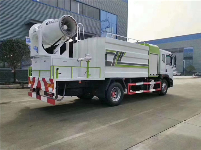 國六東風(fēng)D9抑塵車具有前沖、后灑、側(cè)噴(標(biāo)配鴨嘴噴頭可更換為側(cè)位花灑)、后置式工作平臺(帶踏梯,四周有安全護(hù)欄)、平臺上設(shè)置有高壓水炮(可360°旋轉(zhuǎn),可調(diào)成柱狀,射程28米,也可調(diào)成霧狀,射程14米,可連續(xù)調(diào)成:直沖狀、開花狀、雨狀、半霧狀水流)。湖北程力集團(tuán)生產(chǎn)的這款國六東風(fēng)D9抑塵車灑水寬度大于14米,配備優(yōu)質(zhì)大功率灑水泵,雜物過濾網(wǎng),國標(biāo)通用65型消防接口(可通過消防栓加水)、1套自流球閥系統(tǒng)(可自吸自排,最大吸程6米),2根引水鋼絲膠管 (帶陰陽快速接頭),配鎖,水位計,作業(yè)高音喇叭。兩側(cè)及后加強(qiáng)型保險杠,防滑爬梯,膠管儲存筒。后工作平臺可加裝風(fēng)送式遠(yuǎn)程噴霧機(jī)組,又稱:霧炮,實際射霧距離:20-50米,配備獨(dú)立的柴/汽油發(fā)電機(jī)組,霧炮可手動或遙控操作,遙控距離100米。炮筒可左右旋轉(zhuǎn),上下持續(xù)擺動,以便進(jìn)行全方位噴霧。選裝打藥卷盤,帶手持式打藥桿,可用于死角或重點(diǎn)區(qū)域的噴藥、消毒、清洗、降塵。