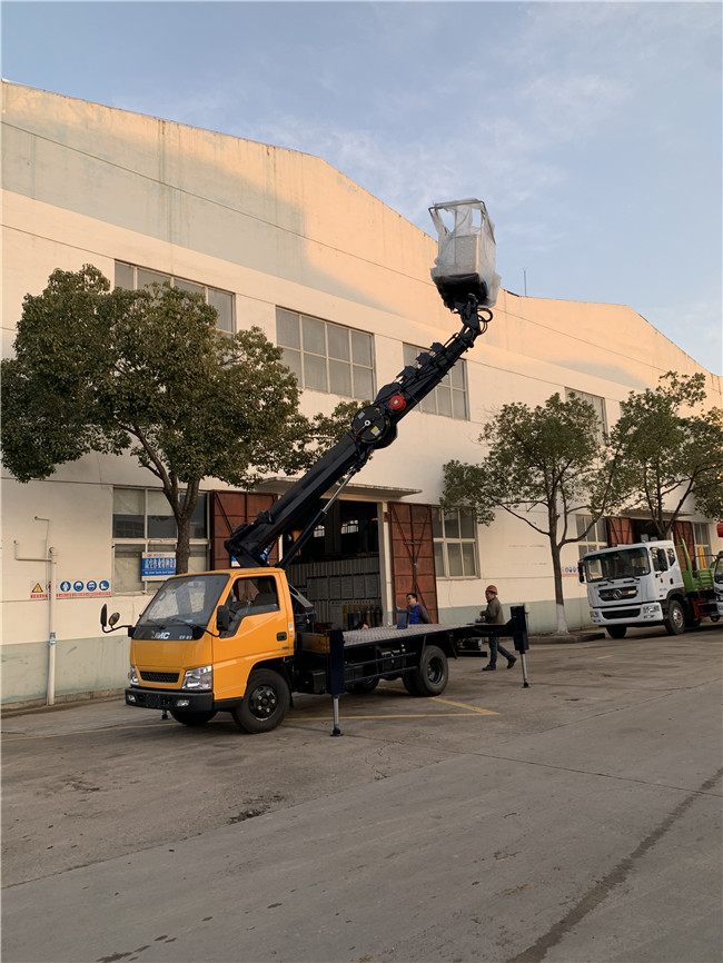 上裝配置:液壓360度全回轉,三節折疊臂,單液壓舉升缸,帶雙向平衡閥,電控操作舉升臂,1噸可伸縮式吊鉤,四支液壓油缸可調式支腿帶雙向液壓鎖(支腿操作為手動操作,可單獨控制)。左右警示燈,黃色車身,全車貼反光標識,雙人穩定作業斗,帶后防護,倆側防護,配一個移動工具箱。