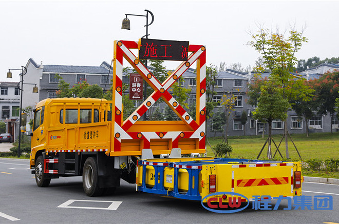 一是設置有升降式大型導向標志牌,規格為2.2M*2.2M.,并貼有大面積紅白相間箭形反光膜。標志牌上安裝有警示排燈和旋轉爆閃燈,用于警示后方車輛前方區域正在作業,追尾危險。此外,還有22只高亮度LED導向燈組,可以顯示多種明確的指向標記,如:向左改道、向右改道、禁止通行等,能夠對后方一公里開外的車輛提供主動安全引導,較大限度降低施工對交通流量的影響。