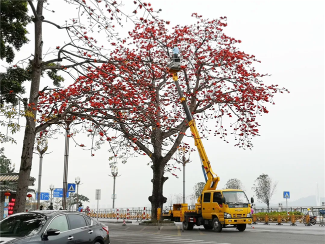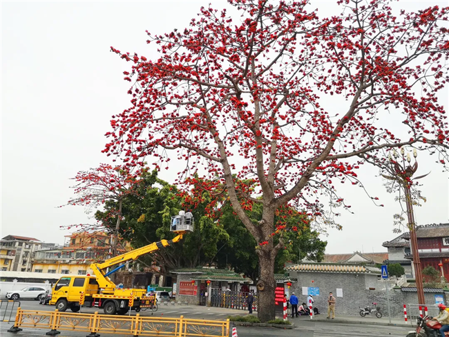 原來,是攝影愛好者為了拍下美美的木棉花,租下了高空作業車,與閱江樓門前怒放的紅棉來個“近距離接觸”。