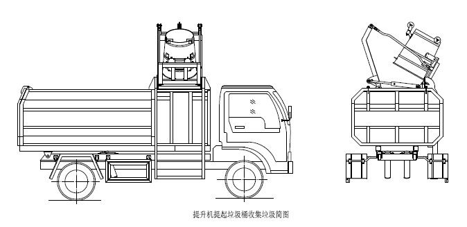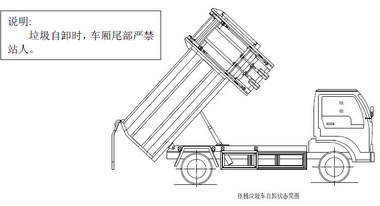 步驟2.將提升操作手柄推至收回位置,箱體右側(cè)提升機(jī)油缸或頂端上蓋開蓋油缸收回,使提升機(jī)帶動垃圾桶向下回落并放置于地面,松開操作手柄使其回到中位,完成一次載,然后松開取力器,該車可以運(yùn)輸行駛。另注意:箱體內(nèi)若加裝小刮板,請按操作指示牌的方向推動手柄,使刮板推出,將箱體前端的垃圾推刮到箱體后部,并且在再次裝載垃圾前將手柄反向拉回,使刮板收回,手柄回中位;以防止垃圾倒入刮板和箱體前端而被卡??;若箱體內(nèi)沒有加裝小刮板,為防止垃圾僅僅裝在箱體前端,這時可將自卸操作手柄推至開啟位置,箱體底部自卸油缸伸出,使箱體繞自卸翻轉(zhuǎn)座旋轉(zhuǎn)舉起一定角度,使箱體前端的垃圾因自重而滑到箱體后部,完成后將操作手柄反向拉回或回中位,箱體下落放平松開手柄。